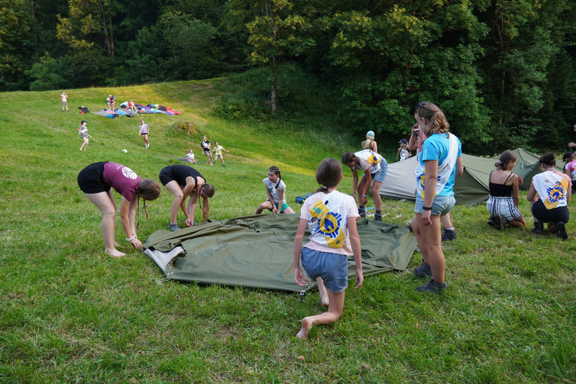 Am nächsten Morgen ging es jedoch wieder turbulent zu: Das Clanoberhaupt hat uns nach dem Morgenessen aufgesucht und uns gedroht, nicht nochmal ins Königreich zu gehen. Er hätte das mitbekommen und Räubern stehe es nicht zu, ins Königreich zu gehen. Wir waren hin und hergerissen, was wir tun sollten. Also haben wir beschlossen, uns eine Gedenkzeit zu nehmen. Wir haben unsere Schlaf- und Campingsachen gepackt, die Ämtli erledigt und sind losgewandert. Mit der Seilbahn ging es den Berg hinauf und dann zu Fuss weiter. Es wurden Lieder gesungen, «Wer bin ich» gespielt, Wandersprüche aufgesagt und viele neue Dinge über andere gelernt. Nach der Mittagspause ging es auch schon weiter und um 15:00 ca. sind wir an unserem Schlafplatz angekommen. Um zur Ruhe zu kommen und über unser Räuberproblem nachzudenken, hatten wie die erste Gruppenstunde. Wir haben gelernt, dass wir alle Situationen im Leben haben, in denen wir uns gefangen fühlen und gerne ausbrechen würden. Am Beispiel der Israeliten, die aus Ägypten fliehen konnten, haben wir 5 Strategien kennengelernt, wie wir ausbrechen können: den aktuellen Standpunkt erkennen, Bequemlichkeit ablegen, Gott mitnehmen, Faszination am Ziel verspüren und Versuchungen widerstehen. Den Unterschied zwischen Räuber- und Königskinder und wie sie handeln würden, haben wir auch besprochen. Schliesslich beschlossen wir, uns nicht mehr wie Räuberkinder, sondern Königskinder zu verhalten. Nach verschiedenen Aktivitäten wie Fussball oder Volleyball spielen, Haare flechten und Zelt aufbauen, haben wir den Znacht gegessen, den unsere Köchinnen uns gebracht haben. Die Räuber Mädchen haben uns nochmal besucht und uns berichtet, dass sie Mut fassen und im Königreich übernachten werden. Nach einer Runde Singen haben wir aufgeteilt auf Berliner Zelte, Gotthard-Tunnel und unterm freien Himmel schlafen. Die Temperaturen blieben schön warm und einige Mädchen erzählten von guten Gesprächen und vielen Sternschnuppen.